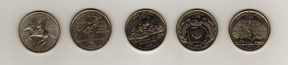 左から順番にDelaware ”The First State" (1787),Rennlylvania "Liberty, Independence, Virtue" (1787),New Jersey "Crossroads of The Revolution" (1787),Georgia "Wisdom, Justice, Moderation" (1788),Connecticut "The Charter Oak" (1788)です。カッコ内は参加年度。